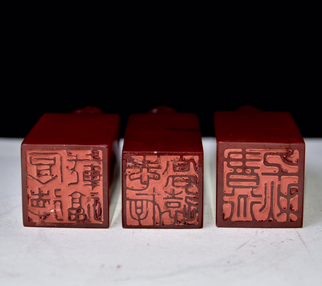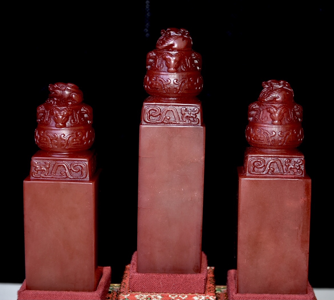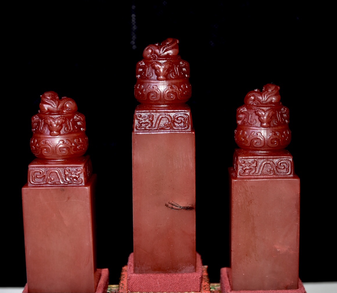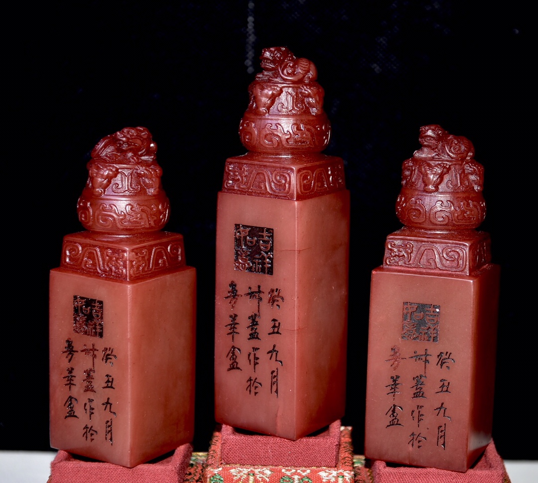 舊藏老貨 壽山石紅田黃石套章 石質通透堅硬 雕工精細 形態各異 造型獨特 保存完整 名家雕刻 尺寸:3.1*3.1*10公分左右(淨高) 總重:604克(硬)