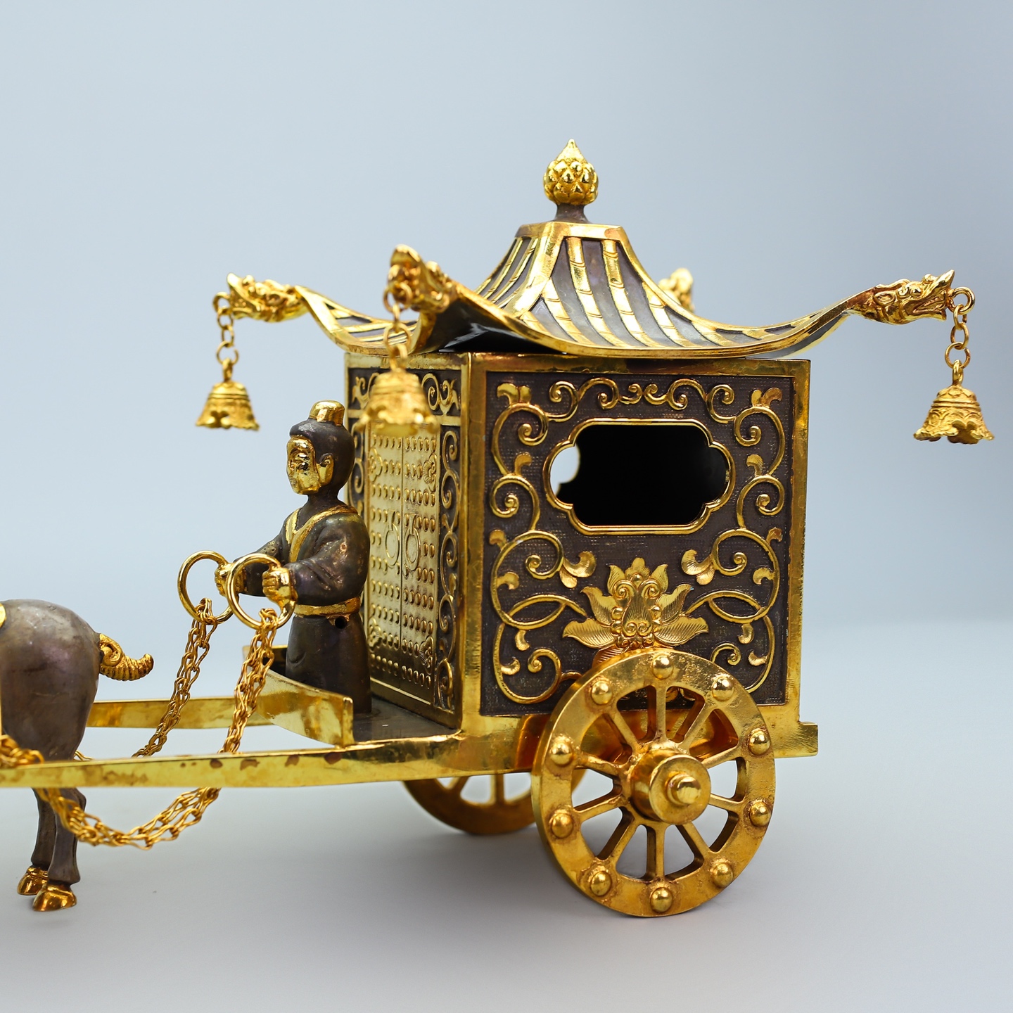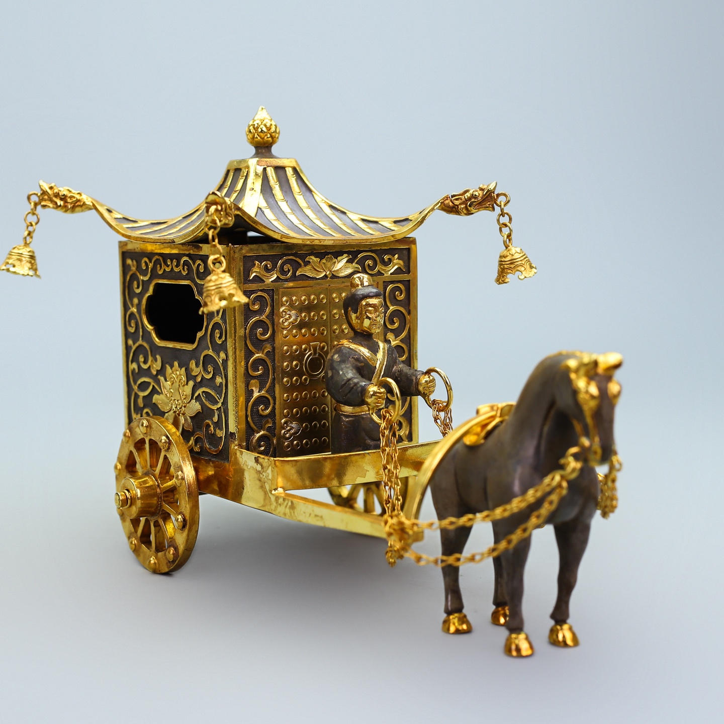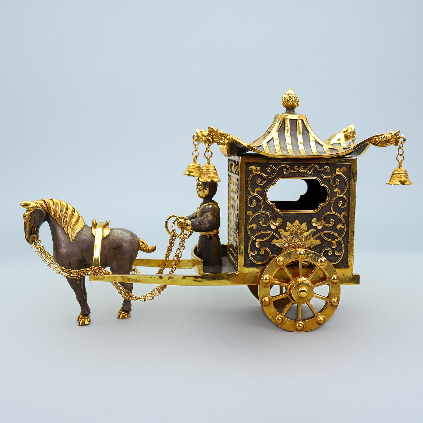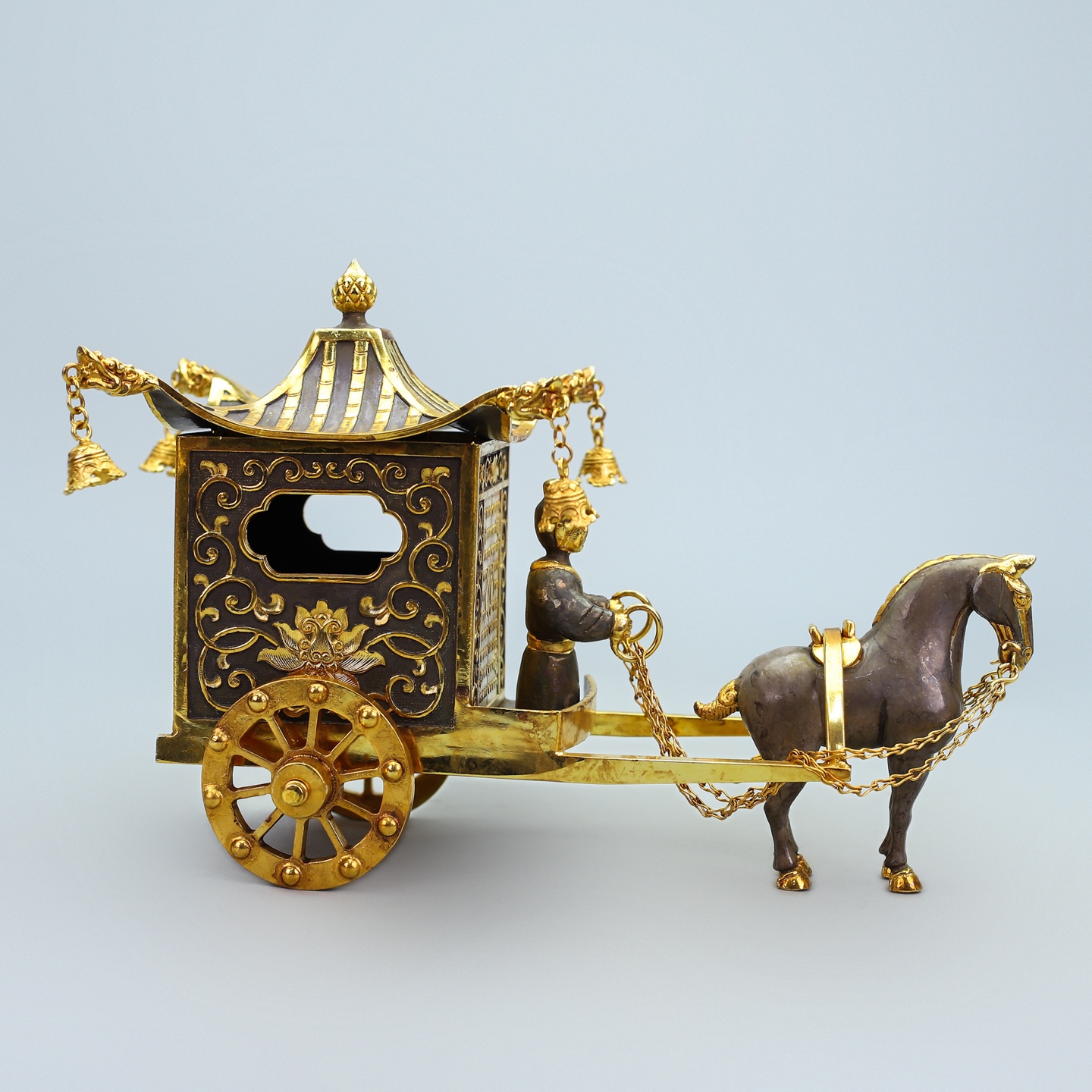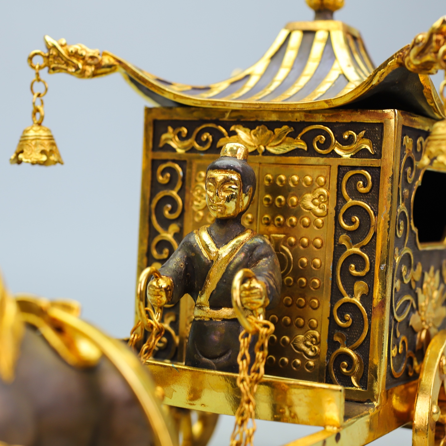 珍藏手工鏨刻局部鎏金浮雕馬拉車 高度:20cm,長度30cm,厚度:9cm,重量:1710克