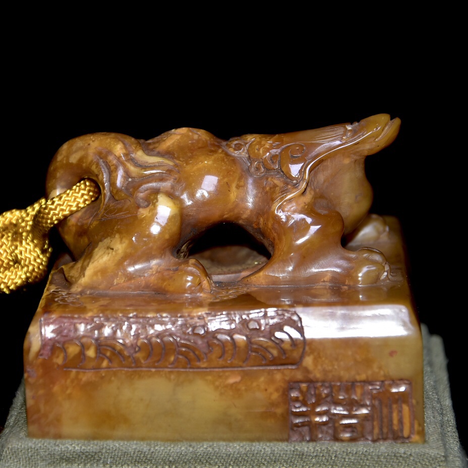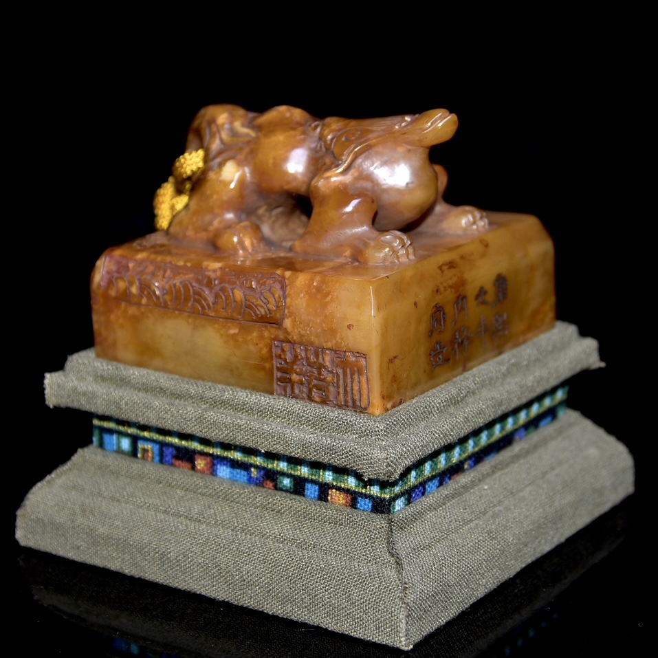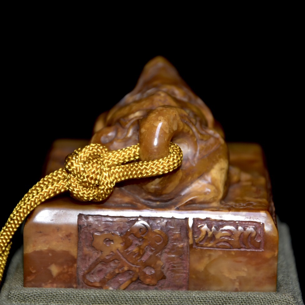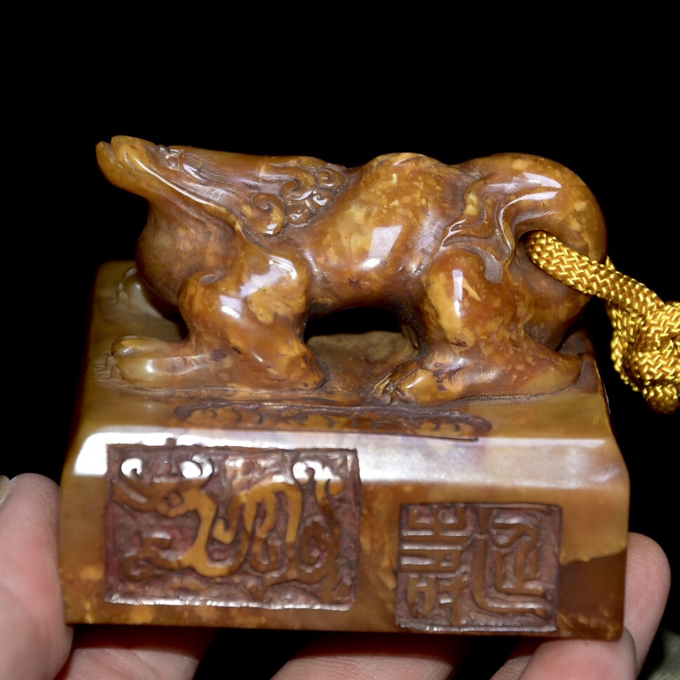 舊藏老貨 壽山石田黃石印章 原石原色純手工雕刻 雕工精細 造型獨特 血絲紋清晰可見 包漿老氣 康熙元年內務府造 尺寸:6.5*6.5*9公分(含底座高)淨高5公分 重量:339公克