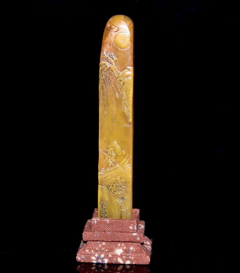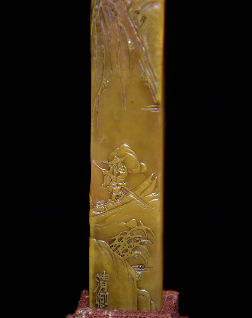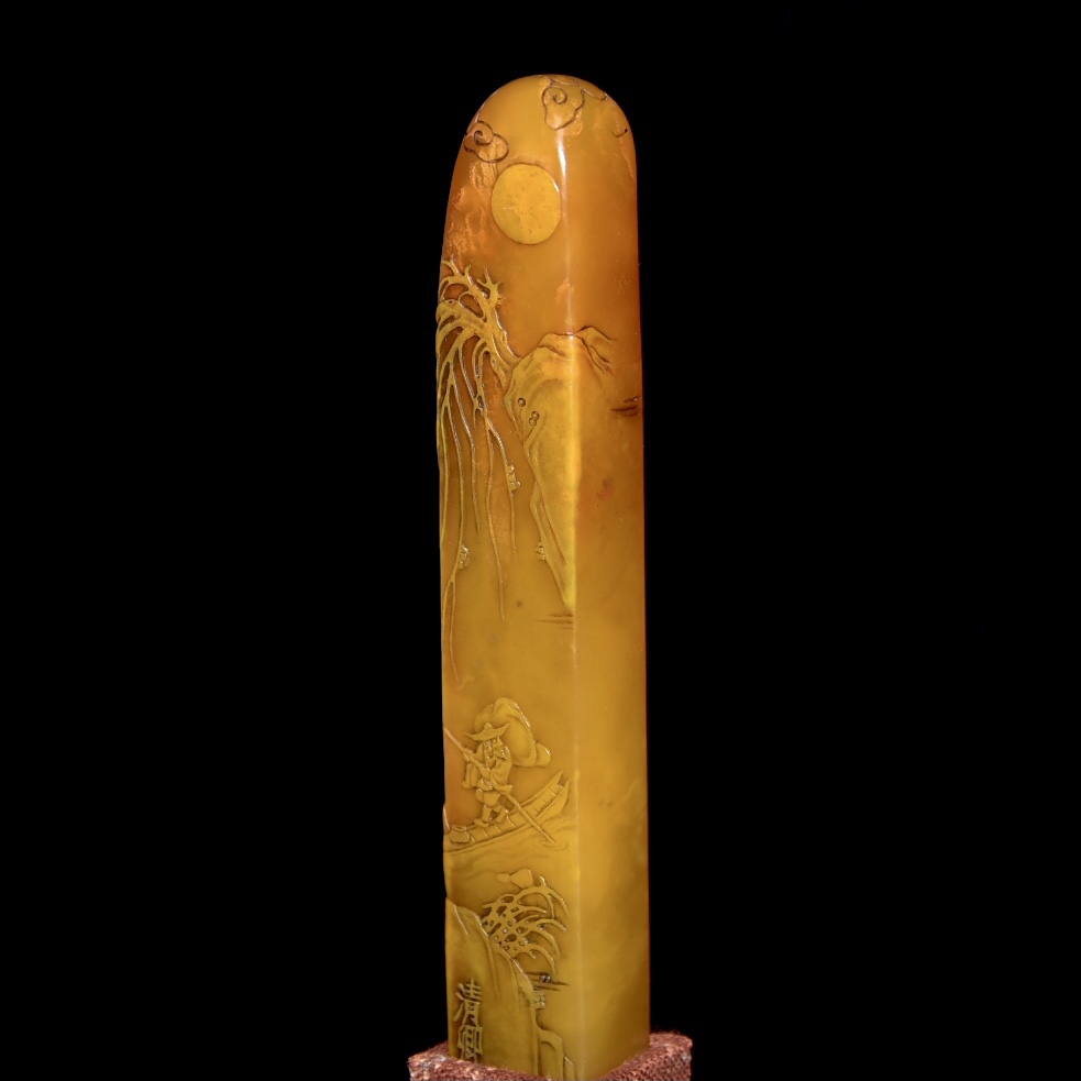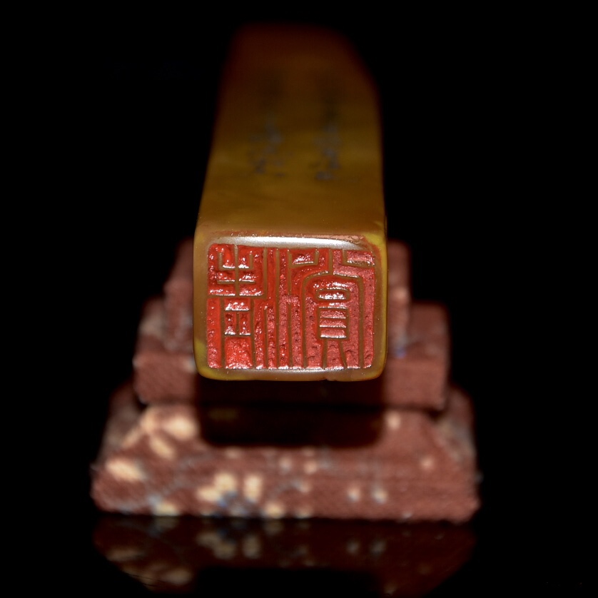 舊藏老貨 壽山石田黃石印章 原石原色雕刻 雕工精細 結晶體結構 血絲紋 蘿蔔絲紋明顯可見 篆刻家【清卿】作 尺寸:2*1.6*15.5公分(含底座高)淨高12.5公分 重量:109克