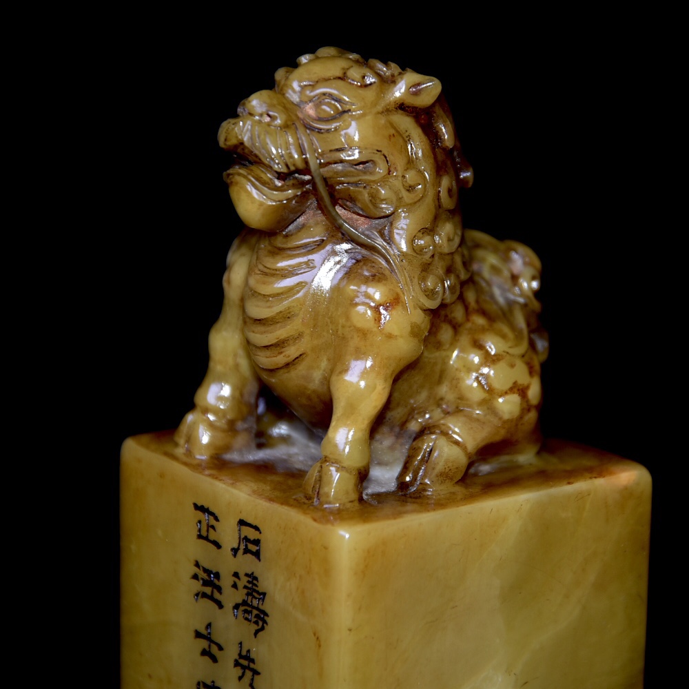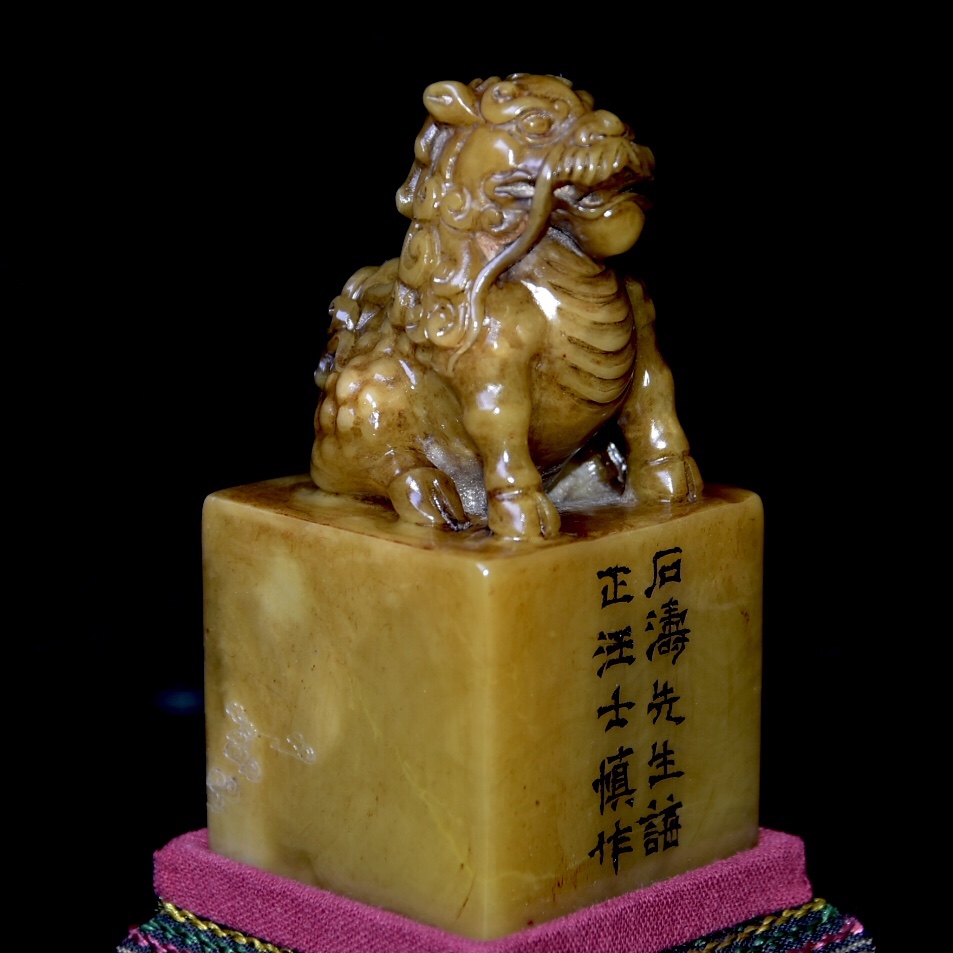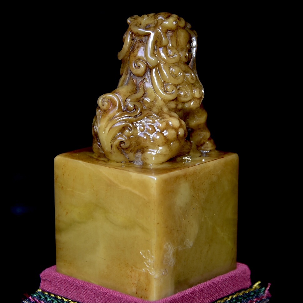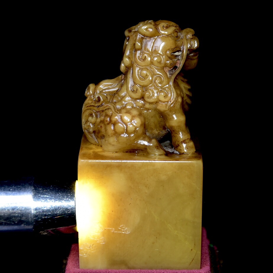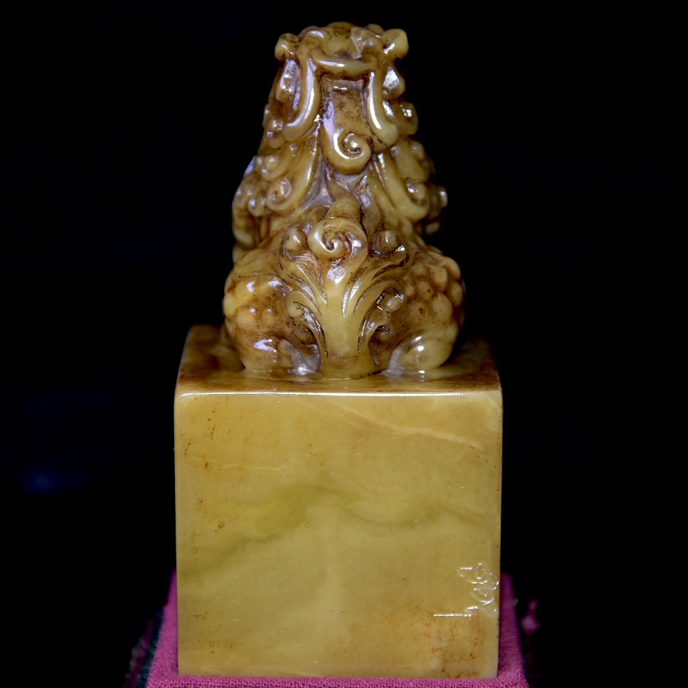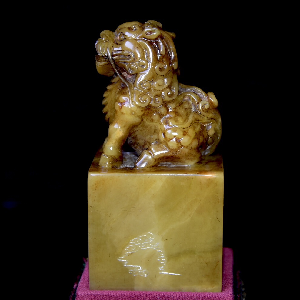 舊藏老貨 壽山石田黃石印章 石質通透堅硬 原石原色純手工雕刻 蘿蔔絲紋清晰可見 包漿老氣 名家雕刻 尺寸:4.3*4.3*11.5釐米(含底座高)淨高8.5釐米 重量:259克