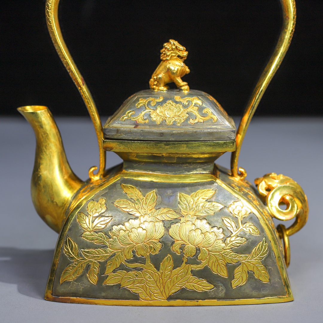 珍藏局部鎏金浮雕工提壺一把 精美絕佳,器型規整,鏨刻工藝精湛 重量:586克,高度:18公分,寬度:13公分珍藏局部鎏金浮雕工提壺一把 精美絕佳,器型規整,鏨刻工藝精湛 重量:586克,高度:18公分,寬度:13公分