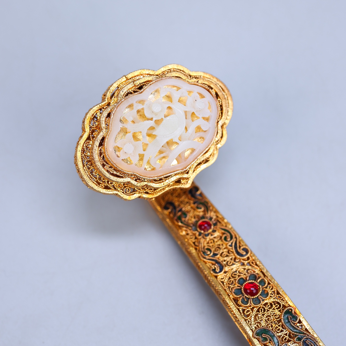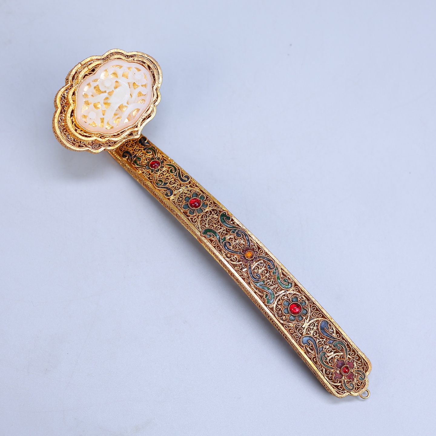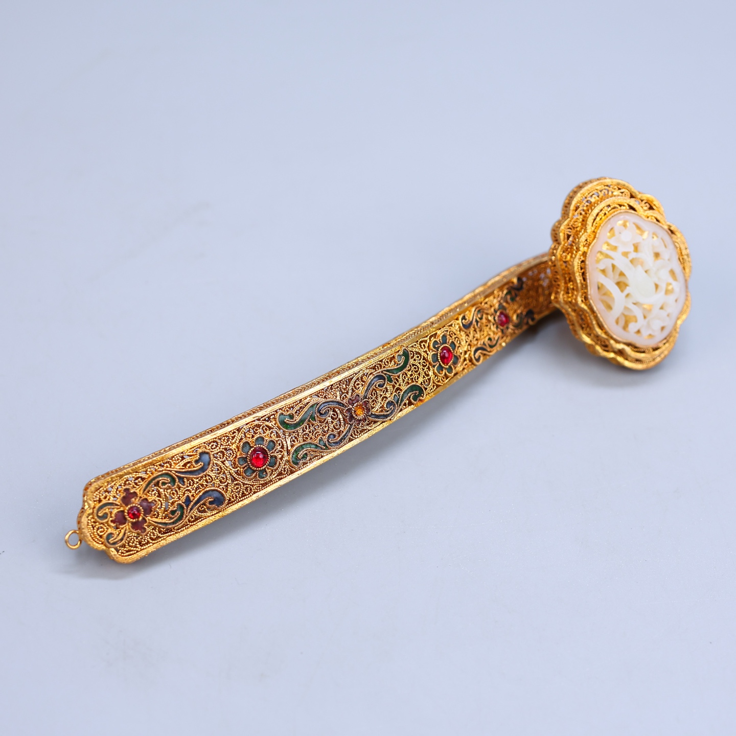 珍寶舊藏掐絲鑲嵌和闐玉如意 長21公分,寬6公分,重125克